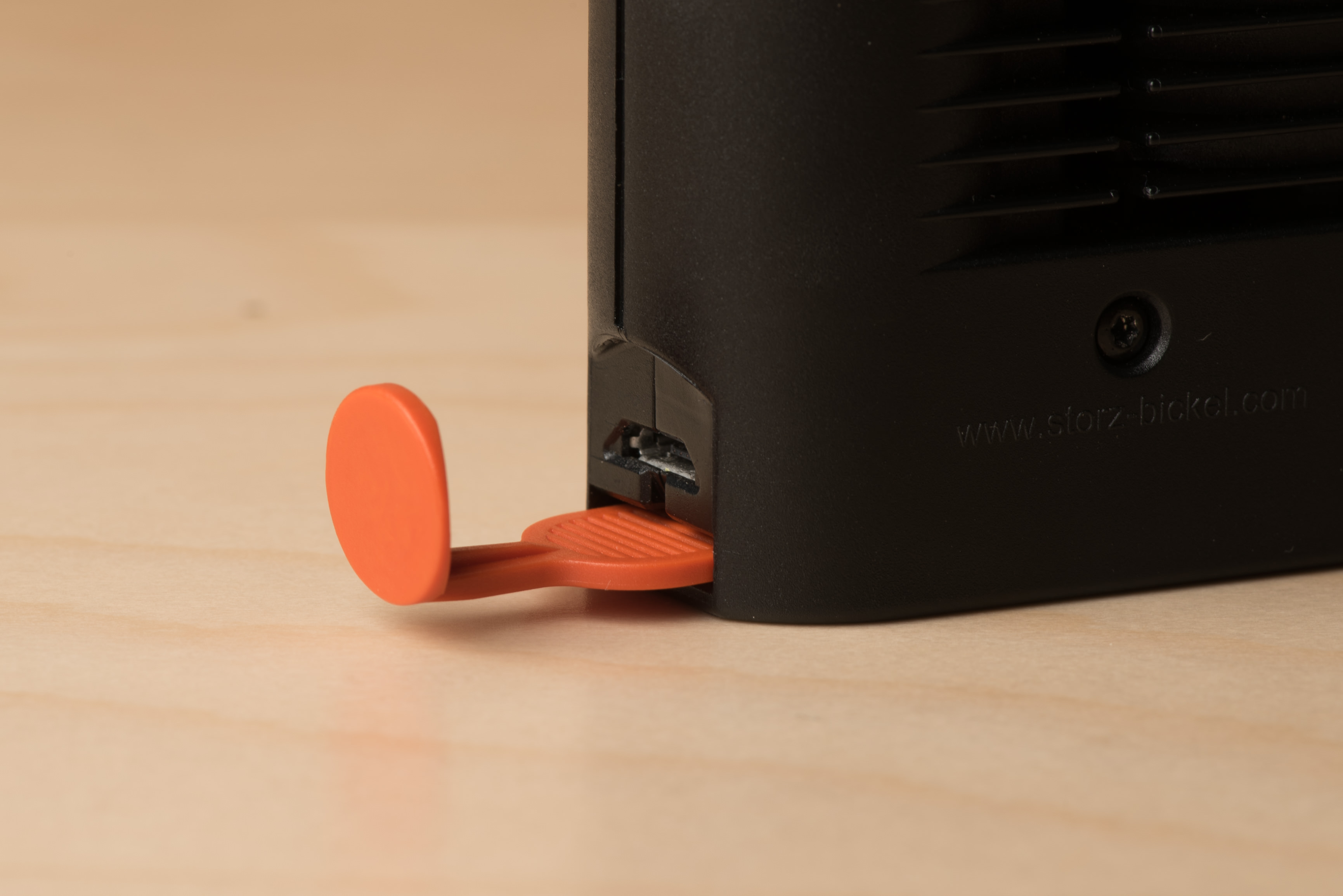 The pick is stored opposite the power button on the bottom of the Crafty. When stored, the pick covers and protects the Crafty’s charging port.