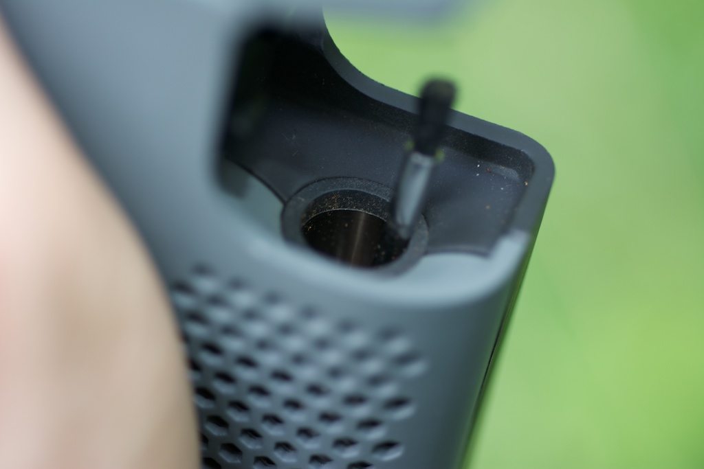 On the “floor” of the opened lid area is the cylindrical herb chamber which is .4″ deep and roughly .3″ diameter. The chamber is made of metal with a screen on the bottom to discourage herbs from falling into the air intake.