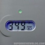 On the front of the vaporizer are three buttons: Power (heating chamber power, not unit power), “-” to decrease temperature, and “+” to increase temperature. Above the buttons is a small LCD screen (used to display temperature and battery life) which glows blue when the DaVinci is powered on. Above the LCD screen is a small heater indicator light which cycles through three colors to indicate the heating chamber status. A blue light means the heating chamber is not active, a red light indicates heating, and a green light for when the heating chamber has reached the proper temperature range. To the right of the indicator light and LCD screen is a grill which exposes the outside of the heating chamber.