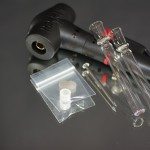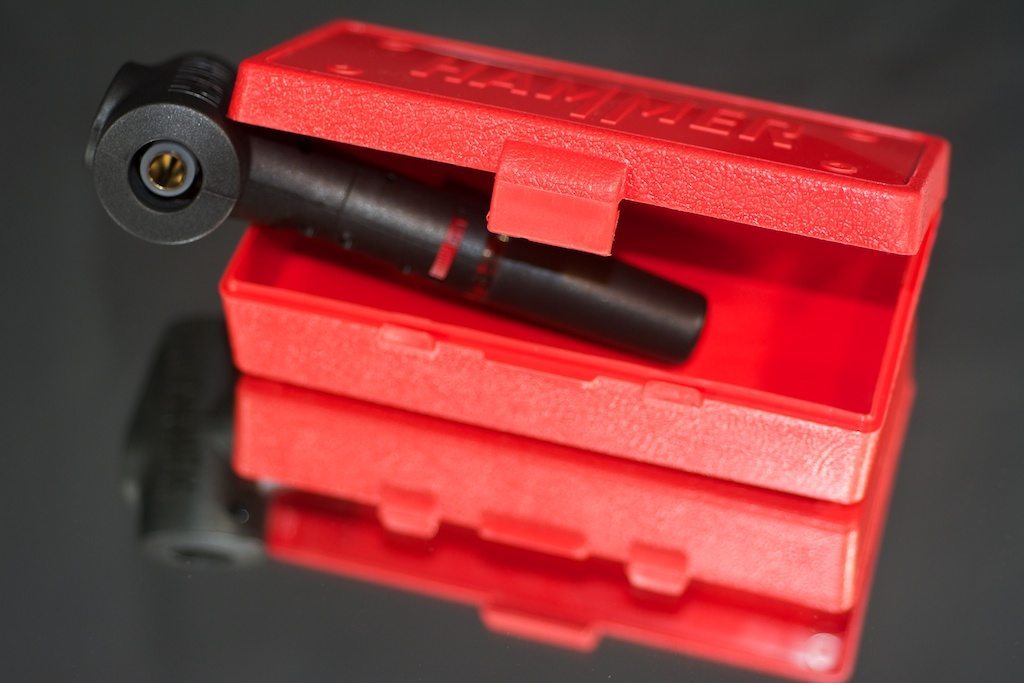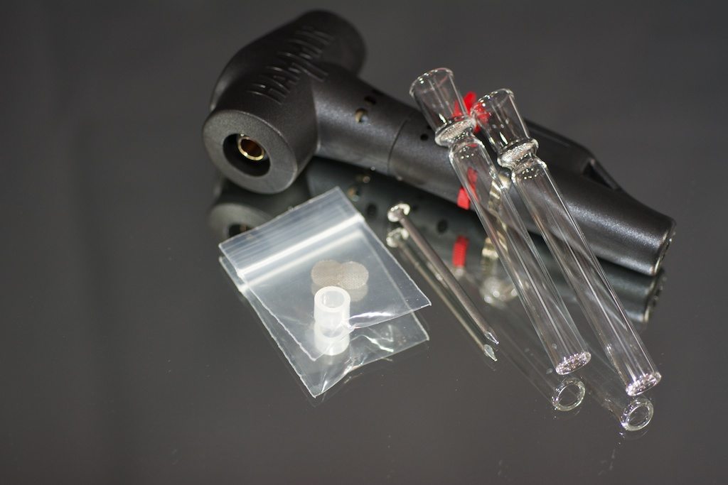 The Hammer is just shy of 5.5″ tall and just over 2.5″ at its widest point (the heat exchanger). The exterior housing is a black plastic with red accents on the trigger and temperature lever. The plastic never gets hot enough to concern me that it won’t hold up. The Lock-On stems are the latest generation draw stem offered by the folks over at Hammer. They feature a slightly larger herb chamber, as well as hands-free operation. The older stem style required you to manually hold the stem against the end of the heat exchanger, while the Lock-On stem style can be pushed onto the heat exchanger and is held in place by a piece of silicone tubing placed around the heat exchanger. The Toolbox is made of bright red plastic and is a perfect fit to house the Hammer, some stems, and has room to spare.