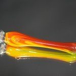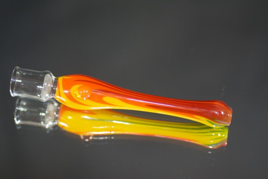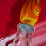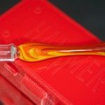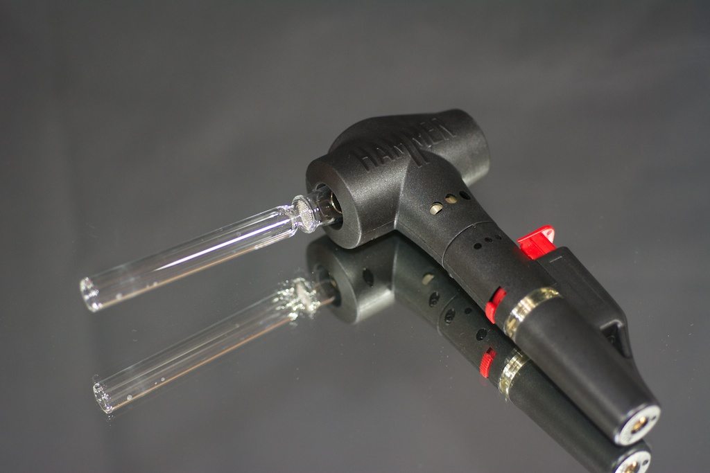The herb is loaded into a glass stem fitted with a screen, the stem pictures above is one of the many custom stem designs offered, the standard stems are clear and lack pattern. The stem is then placed against the “lock-on kit” end of the Hammer and held in place by the silicone around the heat exchanger. The next steps vary based on personal preference. You can either heat the Hammer and draw as it heats, or heat the Hammer and draw after you release the trigger. If you choose to heat the Hammer and draw, you’ll need to preheat the Hammer for at least 30 seconds (in my experience). Choosing to heat then draw means that you’ll have to heat the Hammer for around 60 seconds to get a few (one or two) good hits before having to reheat.